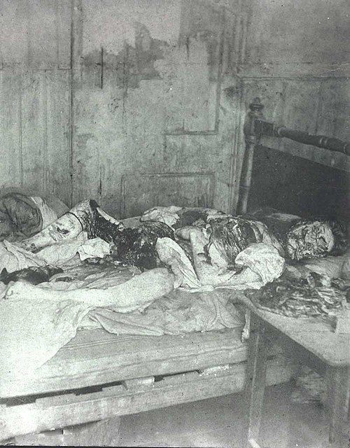 Επίσημη φωτογραφία από την αστυνομία του πτώματος της Μαίρη Τζέην Κέλλυ όπως ανακαλύφθηκε στο νούμερο 13 της Miller's Court στις 9 Νοεμβρίου 1888