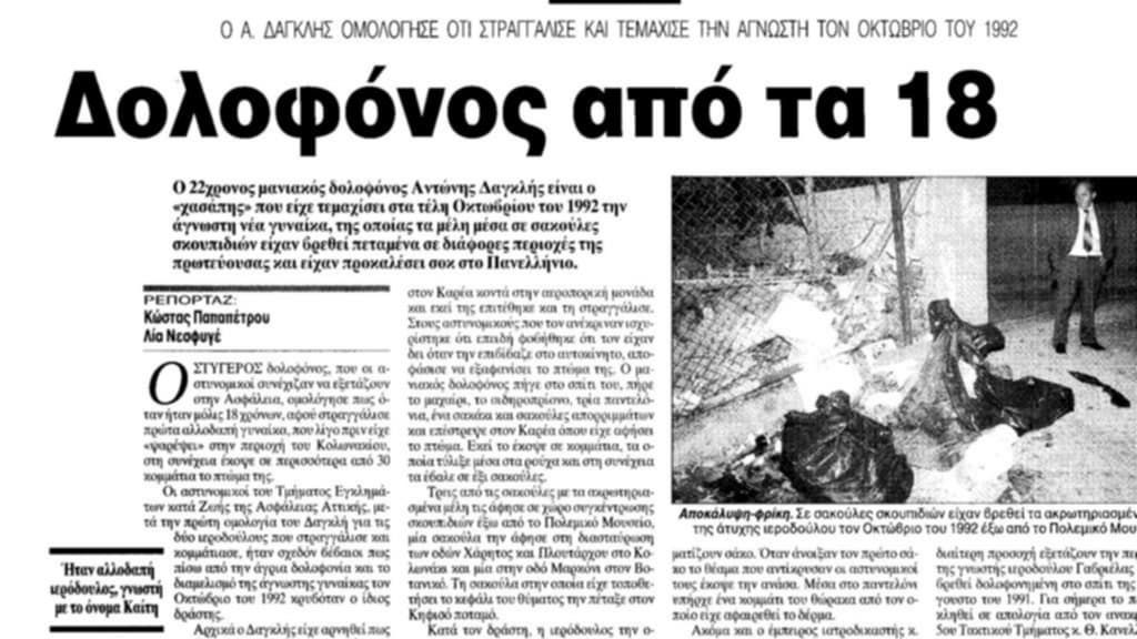Στην εθνική οδό Αθηνών-Λαμίας, στο ύψος των διοδίων της Τραγάνας, εντοπίστηκε το πτώμα της 29χρονης ιερόδουλης Ελένης Παναγιωτοπούλου. Σύμφωνα με τον ιατροδικαστή, ο δολοφόνος, αφού στραγγάλισε το θύμα, της αφαίρεσε τα εντόσθια, της έκοψε τις θηλές του στήθους κι εν τέλει τεμάχισε το πτώμα. Καθώς οι έρευνες απέβαιναν άκαρπες και ο τρόμος είχε διαταράξει τις νύχτες στις πιάτσες του πληρωμένου σεξ της Αθήνας, τα Χριστούγεννα του ίδιου χρόνου φέρνουν άλλη μια μακάβρια ανακάλυψη και αυτή τη φορά στο κέντρο σχεδόν της πόλης. Περαστικοί ανακαλύπτουν σε ένα στενό του Βοτανικού ακόμη ένα πτώμα εκδιδόμενης γυναίκας. Αν και εμφανώς λιγότερο κακοποιημένο από την άτυχη Ελένη Παναγιωτοπούλου, το σώμα του θύματος, της 26χρονης Αθηνάς Λαζάρου, οδηγεί τις αρχές στο συμπέρασμα πως εν προκειμένω έχουν να κάνουν με έναν κατά συρροή δολοφόνο μια που αναγνωρίζουν το modus operandi του προηγούμενου φόνου. Κατά τη διάρκεια των ανακρίσεων αποδείχτηκε πως ο δράστης είχε αποπειραθεί να στραγγαλίσει και άλλες εκδιδόμενες γυναίκες, και εν τέλει θα ήταν οι μαρτυρίες τους και ειδικά αυτή της Βρετανής Ανν Χάνσον που θα οδηγούσαν στον εντοπισμό και τη σύλληψή του. Σύμφωνα με τις μαρτυρίες, ο δράστης χρησιμοποιούσε ένα λευκό βαν μάρκας Volkswagen στο οποίο είχε τοποθετήσει ένα στρώμα, όπου και απομόνωνε αρχικά τα θύματά του με σκοπό να αγοράσει τις υπηρεσίες τους. Σύμφωνα με την Ανν Χάνσον, ο δράστης τύλιξε στο λαιμό της ένα σκοινί και ενώ επιχειρούσε να τη στραγγαλίσει, της είπε: «Όλες οι πουτάνες πρέπει να πεθάνουν». Εκείνη προσπαθώντας να σώσει τη ζωή της, του είπε πως η ίδια δεν ήταν εκδιδόμενη αλλά είχε αναγκαστεί να κάνει προσωρινά αυτή τη δουλειά για να συγκεντρώσει τα χρήματα που χρειαζόταν για να επιστρέψει στην πατρίδα της. Τότε ο δράστης της «χάρισε» τη ζωή και μάλιστα την επέστρεψε στην πιάτσα της Σόλωνος από όπου την πήρε και της είπε να προσέχει.