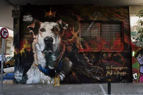 Στο Ψυρρή, ένας συγκινητικός φόρος τιμής απονέμεται στον Λουκάνικο, τον αγαπημένο αδέσποτο σκύλο που έγινε διεθνές σύμβολο διαμαρτυρίας κατά τη διάρκεια των αντικυβερνητικών διαδηλώσεων στην Ελλάδα. Αυτή η τοιχογραφία απαθανατίζει τον "σκύλο των επεισοδίων" με ένα στέμμα, αποτυπώνοντας το πνεύμα του και την ακλόνητη παρουσία του στην πρώτη γραμμή των διαδηλώσεων. Αποτελεί ισχυρή υπενθύμιση μιας ταραγμένης περιόδου στην πρόσφατη ελληνική ιστορία και της ανθεκτικότητας του λαού της, που αντανακλάται ακόμη και στους ζωικούς συντρόφους του.