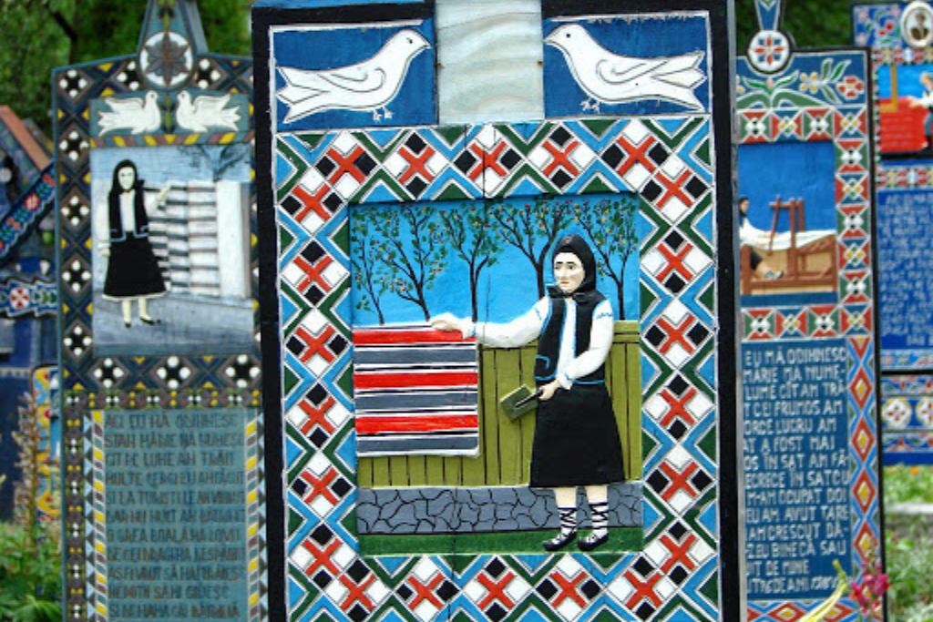Εδώ λοιπόν βρίσκεται ένα από τα πιο ιδιαίτερα και παράξενα κοιμητήρια του κόσμου, σήμερα προστατευόμενο από την UNESCO ως μνημείο της παγκόσμιας πολιτιστικής κληρονομιάς, το «χαρούμενο κοιμητήριο». Εκατοντάδες ξύλινοι τάφοι, ζωγραφισμένοι με χαρωπά ζωηρά χρώματα και αστεία ή σκωπτικά επιγράμματα, δημιουργούν ως εικόνα μια αίσθηση χαράς και απελευθέρωσης, μακριά από τη μελαγχολία και τη θλίψη του πένθους και της απώλειας. Ο Ioan Stan Patrasσχεδίασε και κατασκεύασε τον πρώτο «χαρούμενο» τάφο του το 1908 σε ηλικία 14 ετών. Το 1935 πρόσθεσε ποιητικά επιγράμματα, γραμμένα στο τοπικό ρουμανικό ιδίωμα. Έκτοτε και μέχρι το θάνατό του, το 1977, κατασκεύασε περισσότερους από 800 τάφους, εκφράζοντας πάντα την ίδια αντίληψη, της χαράς και της περιφρόνησης του θανάτου. Την παράδοση που δημιούργησε τη συνέχισε ο μαθητής του Dimitru Pop.