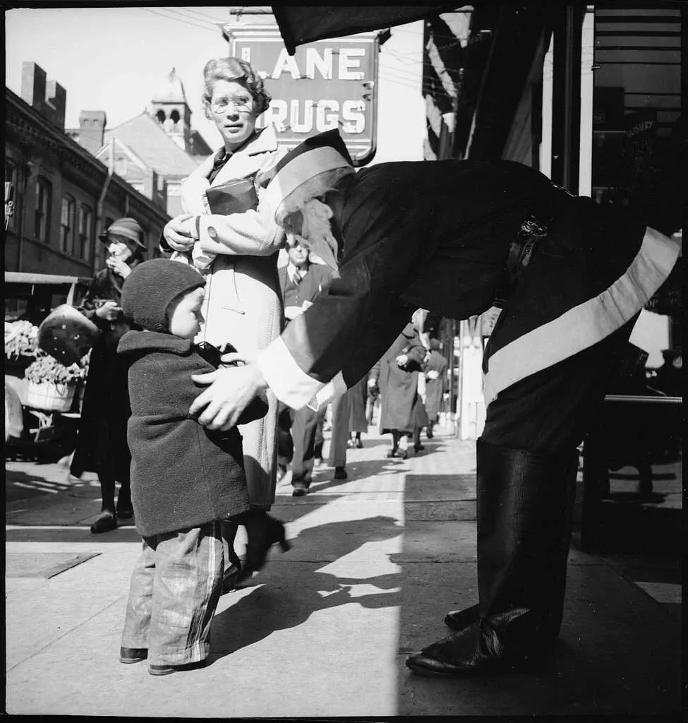 Κατά τη διάρκεια της Μεγάλης Ύφεσης, οι Ηνωμένες Πολιτείες και ο κόσμος αντιμετώπισαν τεράστιες οικονομικές δυσκολίες. Παρά την απελπισία, πολλοί προσπάθησαν να διατηρήσουν το πνεύμα των Χριστουγέννων ζωντανό. Αυτή η εικόνα του Άγιου Βασίλη να στέκεται στην Wall Street, πιθανώς προσπαθώντας να φέρει λίγη χαρά στους περαστικούς ή να συλλέξει χρήματα για φιλανθρωπικούς σκοπούς, είναι ένα ισχυρό σύμβολο ανθεκτικότητας και ελπίδας σε δύσκολες εποχές.