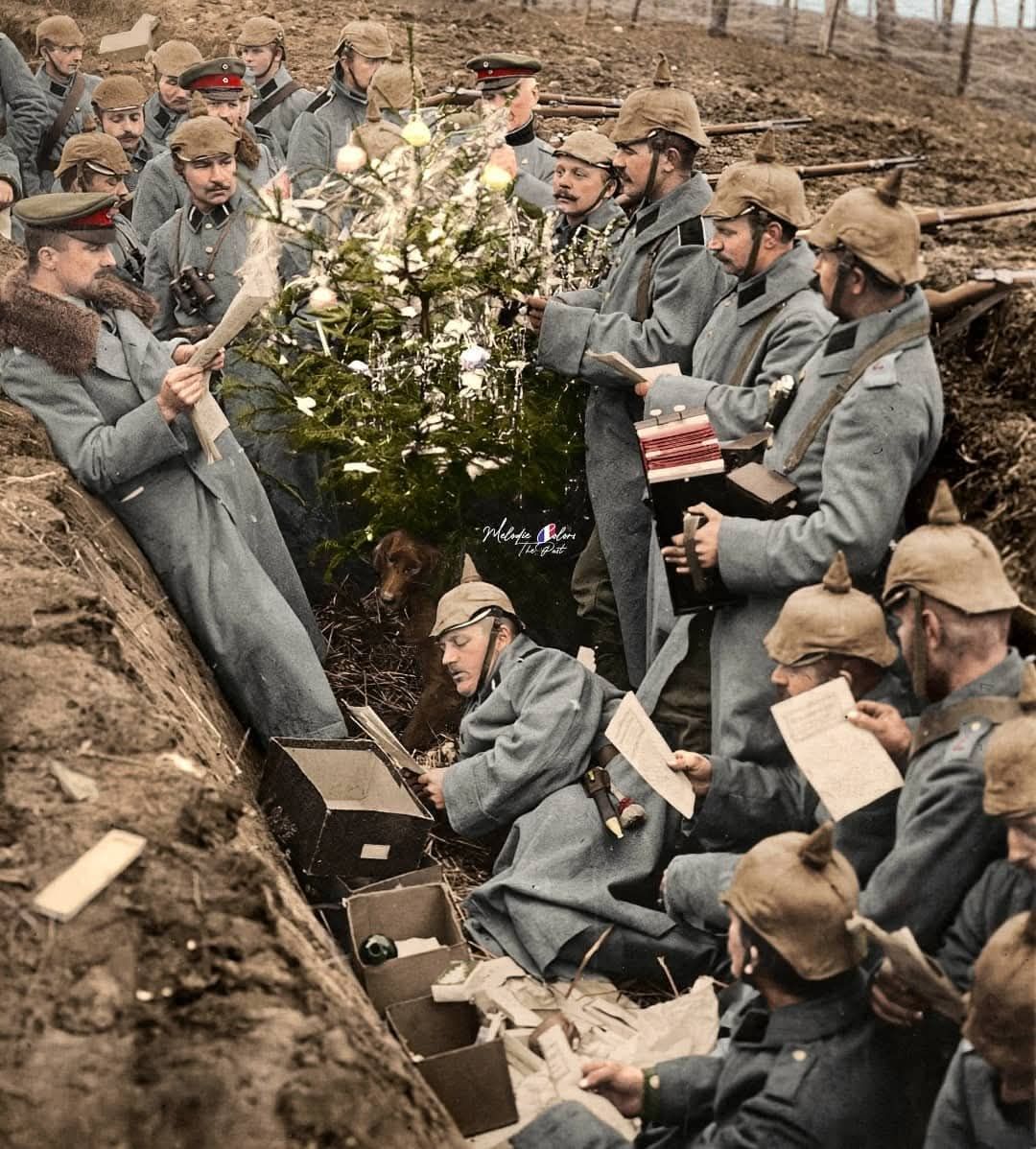 Εν μέσω της φρίκης του Α' Παγκοσμίου Πολέμου, συνέβη ένα αξιοσημείωτο γεγονός γνωστό ως η Ανακωχή των Χριστουγέννων. Σε διάφορα σημεία του Δυτικού Μετώπου, Βρετανοί και Γερμανοί στρατιώτες βγήκαν από τα χαρακώματά τους την παραμονή των Χριστουγέννων, αντάλλαξαν δώρα, τραγούδησαν κάλαντα και έπαιξαν ακόμη και ποδόσφαιρο. Αν και οι φωτογραφίες από αυτό το γεγονός είναι σπάνιες, αυτή η εικόνα ενός αυτοσχέδιου χριστουγεννιάτικου δέντρου που στολίστηκε από τους στρατιώτες στα χαρακώματα, αποτελεί μια συγκλονιστική υπενθύμιση της ανθρωπιάς που μπορεί να ανθίσει ακόμη και στις πιο σκοτεινές στιγμές.